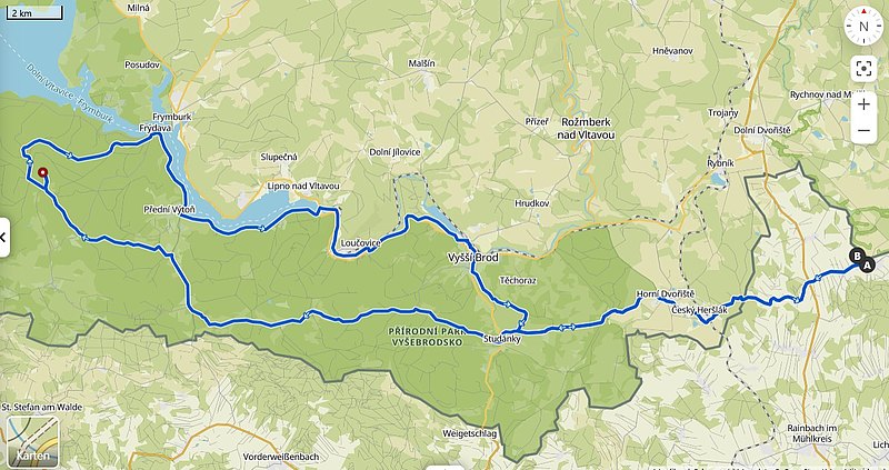 Bei schönsten Wetter ging´s um 9 Uhr los beim Wanderschuh in Leopoldschlag. Bis Edlbruck kamen nach und nach alle 15 Teilnehmer zusammen. In Böhmisch Hörschlag hatten wir den ersten Ausfall - irreparabler Reifenschaden. Wir restlichen fuhren weiter nach Studánky, Kapellen um etwa um 11:30 in Svatý Tomáš ankamen. Im Restaurace Svatý Tomáš stärkten wir und unsere Räder mit Essen, Trinken und Atomstrom. Anschließend Besichtigung der Burgruine Vítkův, um danach in rasender Fahrt zum Lipno-Stausee fuhren. Weiter ging´s auf dem gut ausgebauten Radweg nach Vyšší Brod um zum Abschlus in der "Erfrischungsstation" in Horní Dvořiště unsere letzte Einkehr machten.